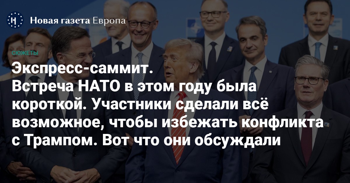 Отсутствие подробных дискуссий на этот счет показательно: организаторы всеми силами старались сделать саммит «коротким и приятным». Накануне двухдневного мероприятия его цель именно такими словами обрисовал газете The Times неназванный дипломатический источник. Что касается краткости, то в разговоре с «Новой-Европа» бывший заместитель помощника генсека НАТО по новым вызовам безопасности Джейми Ши отметил: «Трамп не любит долгие многосторонние встречи и склонен скучать, слушая длинные речи за столом переговоров». «Больше действий, меньше разговоров», — чуть иначе расставила акценты пресс-секретарь президента Трампа Кэролайн Ливитт.