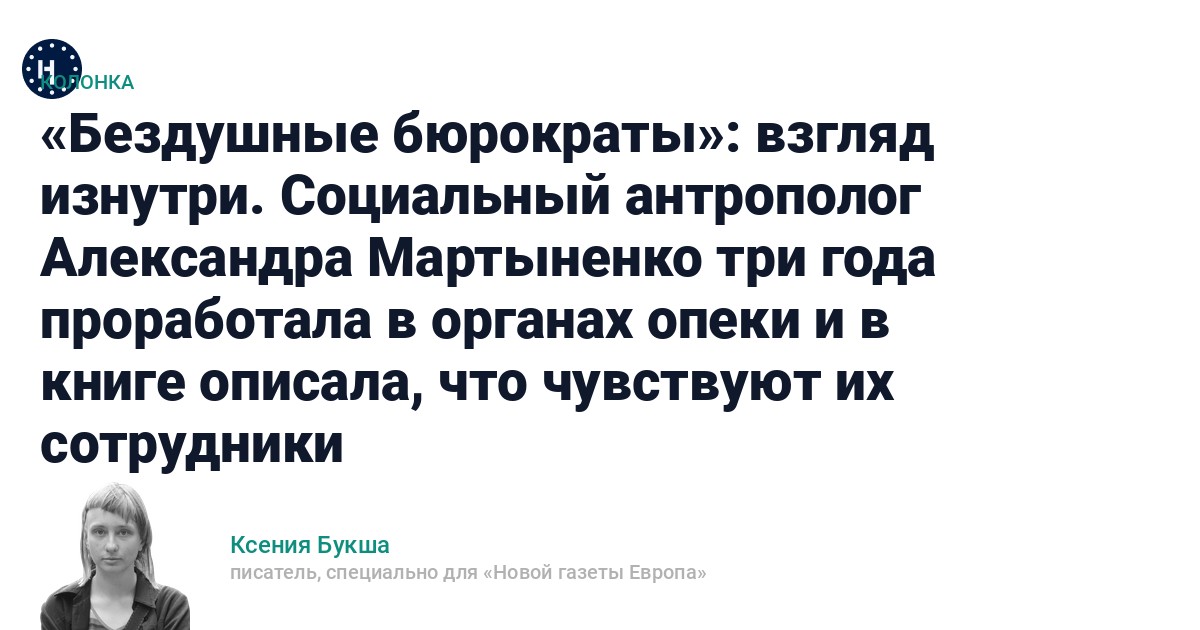Исследование Александры Мартыненко не имеет дела с нормативными суждениями («как должно»). Оно описывает реальное положение вещей («как есть»). Проявляя огромное уважение к тем сотрудникам и сотрудницам опеки, которые вопреки всему выполняют свою работу, по словам исследовательницы, «без надежды на благодарность, без иллюзий о переменах, без права на ошибку», я бы всё же хотела, из другой позиции, назвать вещи своими именами.