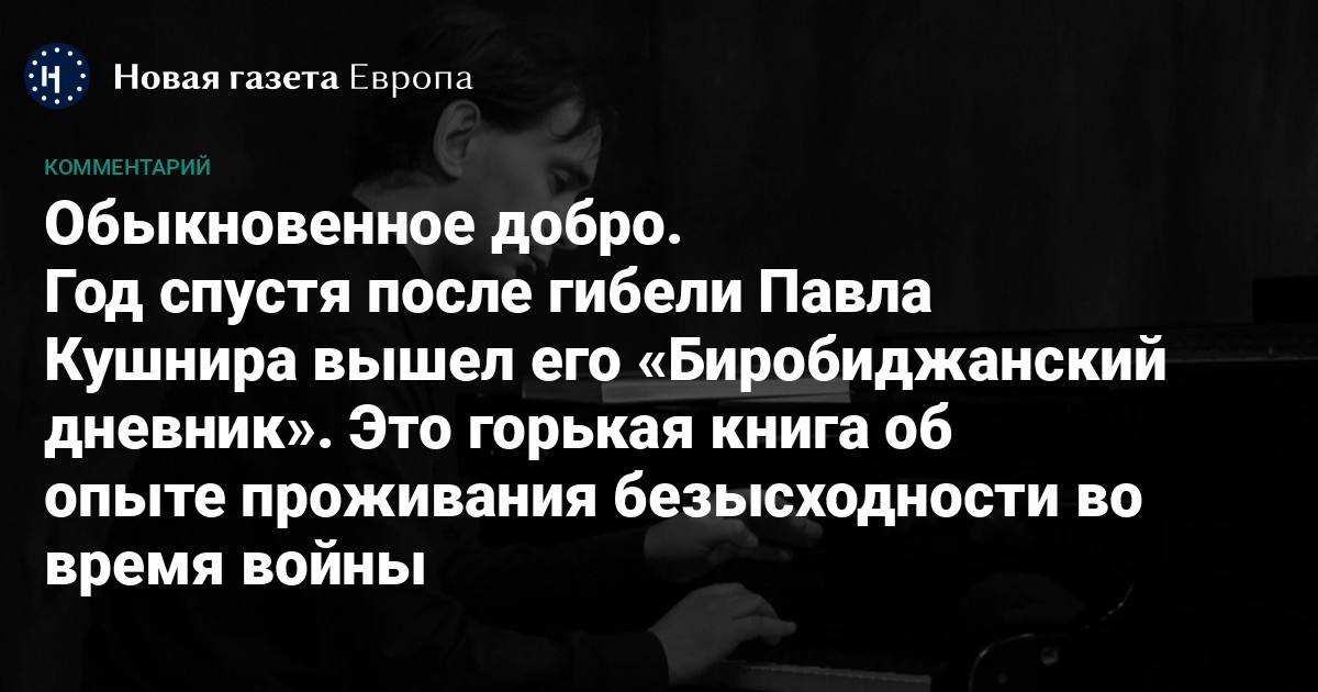 27 июля 2024 года в СИЗО Биробиджана погиб 39-летний Павел Кушнир, пианист, композитор и писатель. За решетку его поместили за антивоенные ролики, которые он выложил в собственном ютуб-канале «Иноагент Малдер». На него было подписано пять человек. После его смерти о Павле Кушнире узнали во всем мире: сегодня ему посвящают концерты, статьи, выступления, книги. В июле 2025 года режиссер и продюсер Рома Либеров вместе с предпринимателем Эдуардом Пантелеевым учредили в Лондоне благотворительную стипендию имени Кушнира, а в издательстве «Медузы» вышла его книга «Биробиджанский дневник» (об истории издания можно прочитать здесь). Об этой книге и о том, как текст стал способом Кушнира выступить против войны, рассказывает Семен Владимиров.