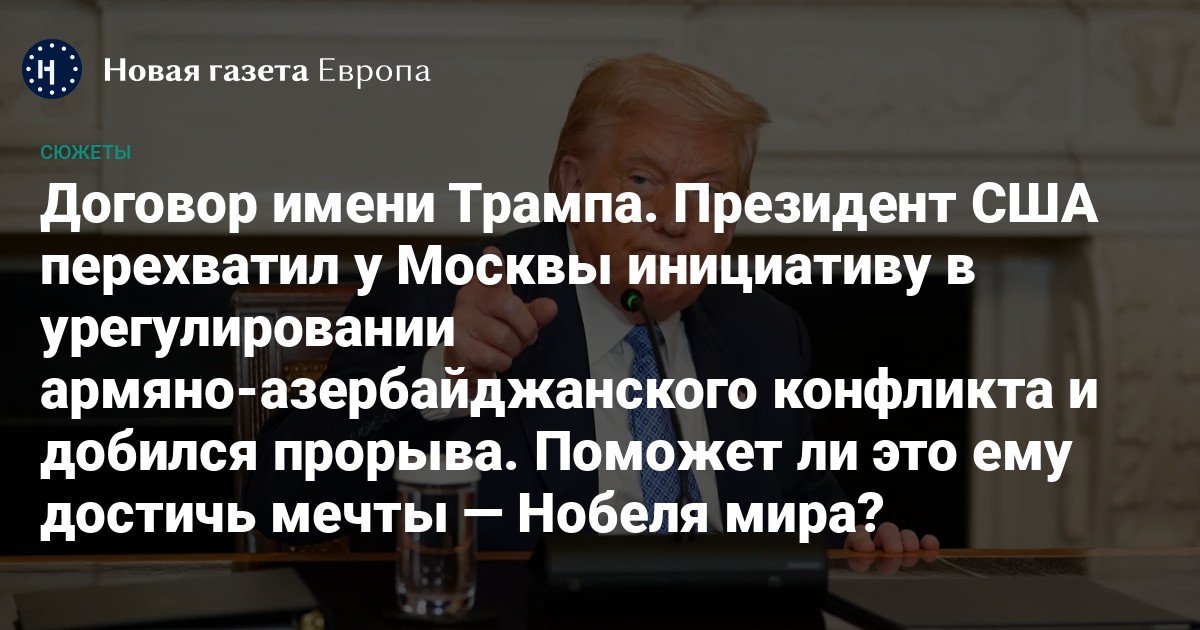 Этой же тактикой воспользовались теперь и Ильхам Алиев с Николом Пашиняном: на переговорах в Белом доме они пообещали отправить в Нобелевский комитет совместную заявку. «За последние несколько месяцев Вы принесли мир в Азию, Африку и, наконец, на Южный Кавказ. Это невероятно», — не скрывал эмоций президент Алиев. Премьер Пашинян выступал в том же духе, заверяя, что без «решительной приверженности» Трампа миротворчеству прорыва в армяно-азербайджанском урегулировании не было бы еще много лет.