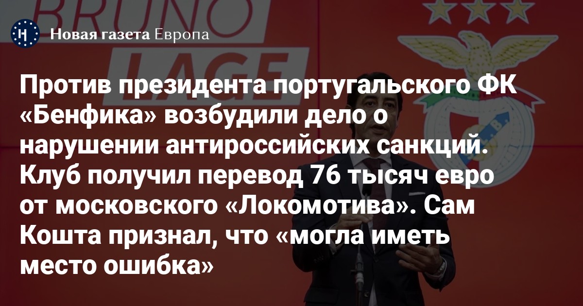 Против президента португальского футбольного клуба «Бенфика» Руя Кошты возбудили дело о нарушении антироссийских санкций из-за того, что тот получил перевод в размере 76 тысяч евро от московского «Локомотива». Об этом сообщает CNN Portugalia со ссылкой на соответствующие документы.