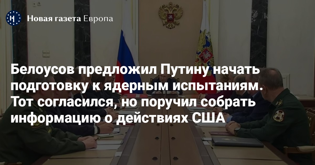 Белоусов заявил, что США последовательно выходят из договоров по ядерному сдерживанию и активно наращивают стратегическое вооружение. Путин согласился с министром и заявил, что РФ должна дать ответные действия на проведение ядерных испытаний «другими участниками Договора о всеобъемлющем запрещении ядерных испытаний».