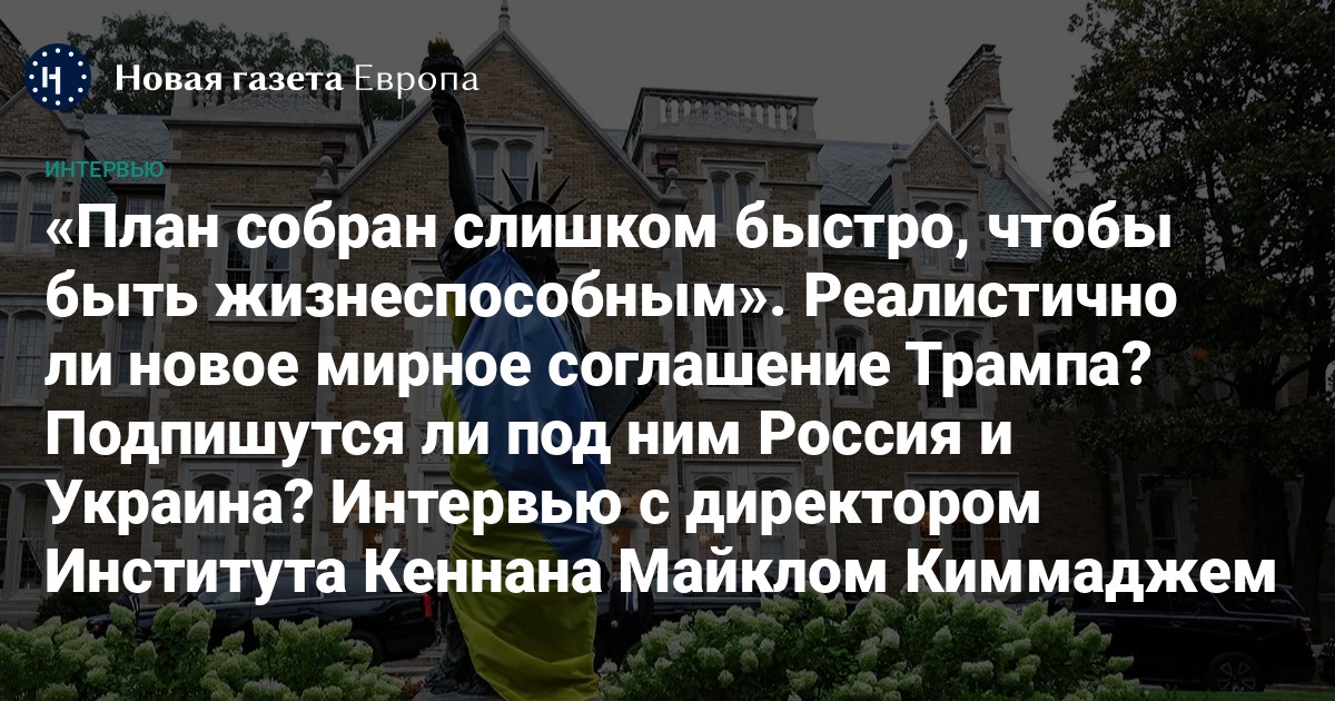 В интервью «Новой газете Европа» директор Института Кеннана (Kennan Institute, Вашингтон) — одного из наиболее авторитетных западных центров по изучению постсоветского пространства — Майкл Киммадж рассказал, почему он на 99% уверен в провале плана Трампа, а также порассуждал о сценариях, при которых Киев может согласиться на болезненные уступки, а Москва — на прекращение атак.