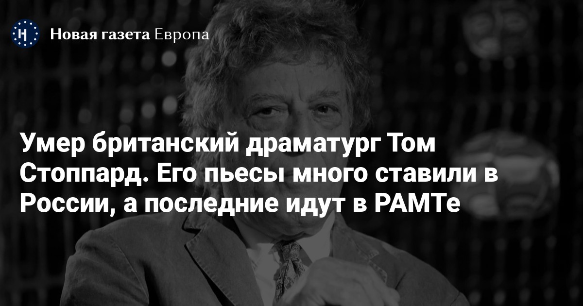 Британский драматург Том Стоппард, чьи пьесы десятилетиями шли на сценах России и во многих других странах мира, умер в возрасте 88 лет. Об этом сообщило его агентство United Agents. Драматург скончался дома в Дорсете в окружении семьи.