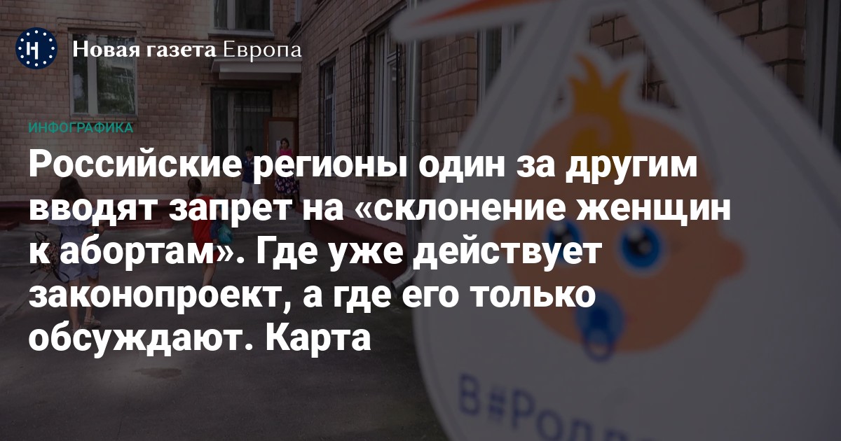 На этой неделе депутаты Иркутской области одобрили законопроект, который запрещает «склонять женщин к прерыванию беременности». По подсчетам «Новой-Европы», аналогичный закон уже действует в 30 регионах России, а также аннексированном Крыму. Еще 15 регионов и оккупированная «ДНР» собираются принять такой законопроект.