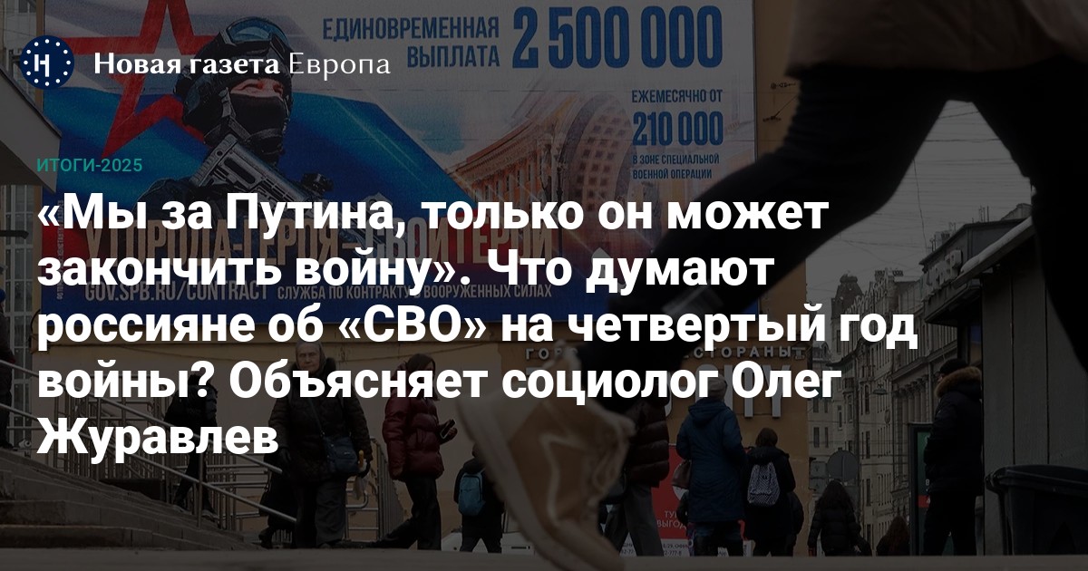 Две трети россиян — согласно недавним опросам, 64% — хотели бы скорейшего прекращения войны в Украине. При этом еще недавно 40% опрошенных рассказывали социологам, что во время войны стали жить лучше, а регион их и вовсе хорошеет на глазах. И тут же социологи фиксируют, что с каждым годом всё меньше россиян говорят о своей готовности пойти воевать лично. Как изменилось отношение к войне в России за эти четыре года? Влияет ли это на желание Путина убивать людей и дальше? На эти и другие вопросы «Новой-Европа» отвечает социолог, исследователь Лаборатории публичной социологии PS Lab Олег Журавлев.