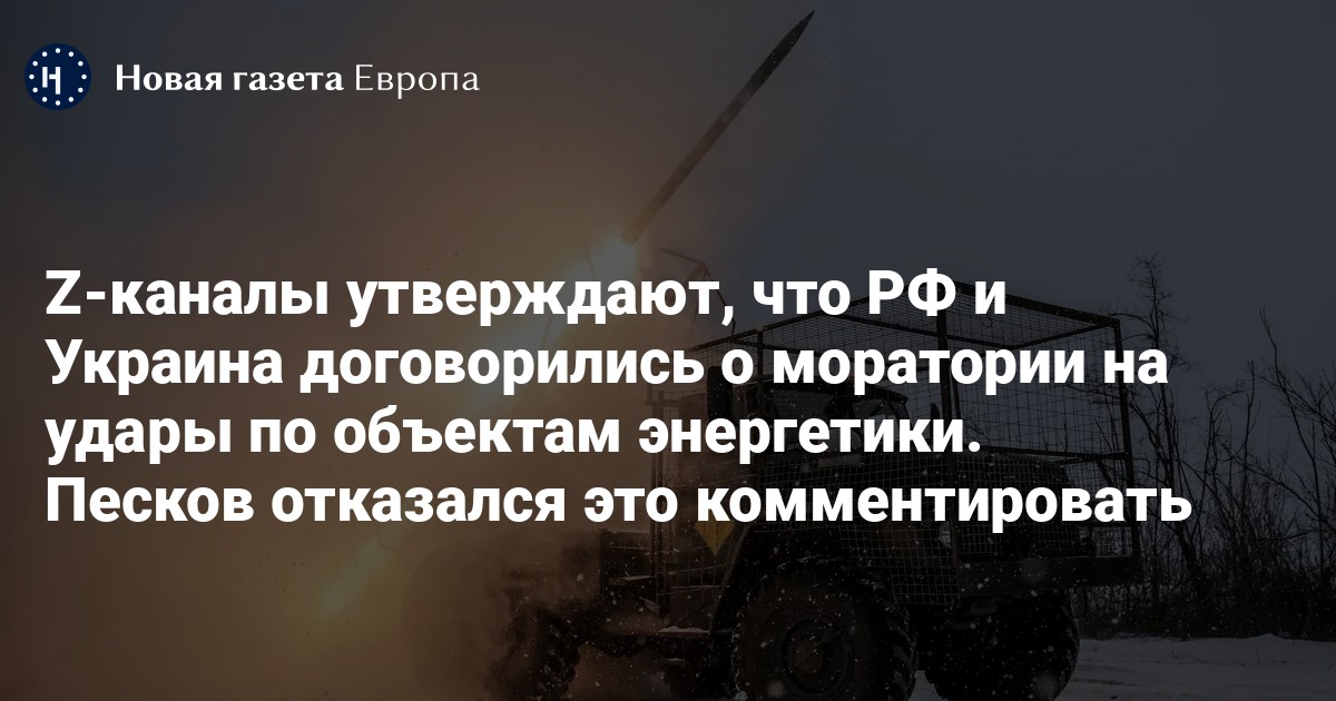 Z-каналы утверждают, что Россия и Украина договорились о моратории на удары по объектам энергетики. Большинство украинских каналов и экспертов назвали эту информацию «провокацией», Песков отказался ее комментировать